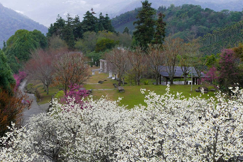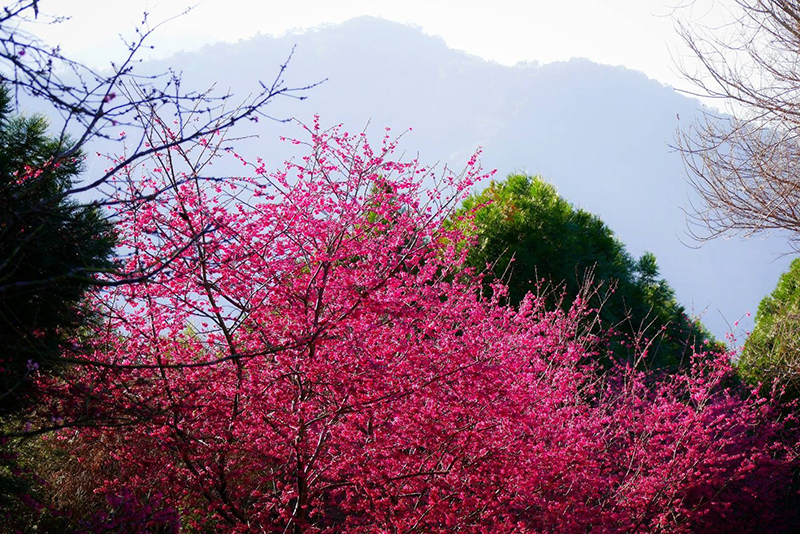 2026年元月底 紅色的緋寒櫻 和白色的福爾摩沙櫻花同時綻放 二月中八重櫻 二月底粉紅的富士櫻 三月中稀有台灣霧社白櫻 四月紅笠櫻花綻放